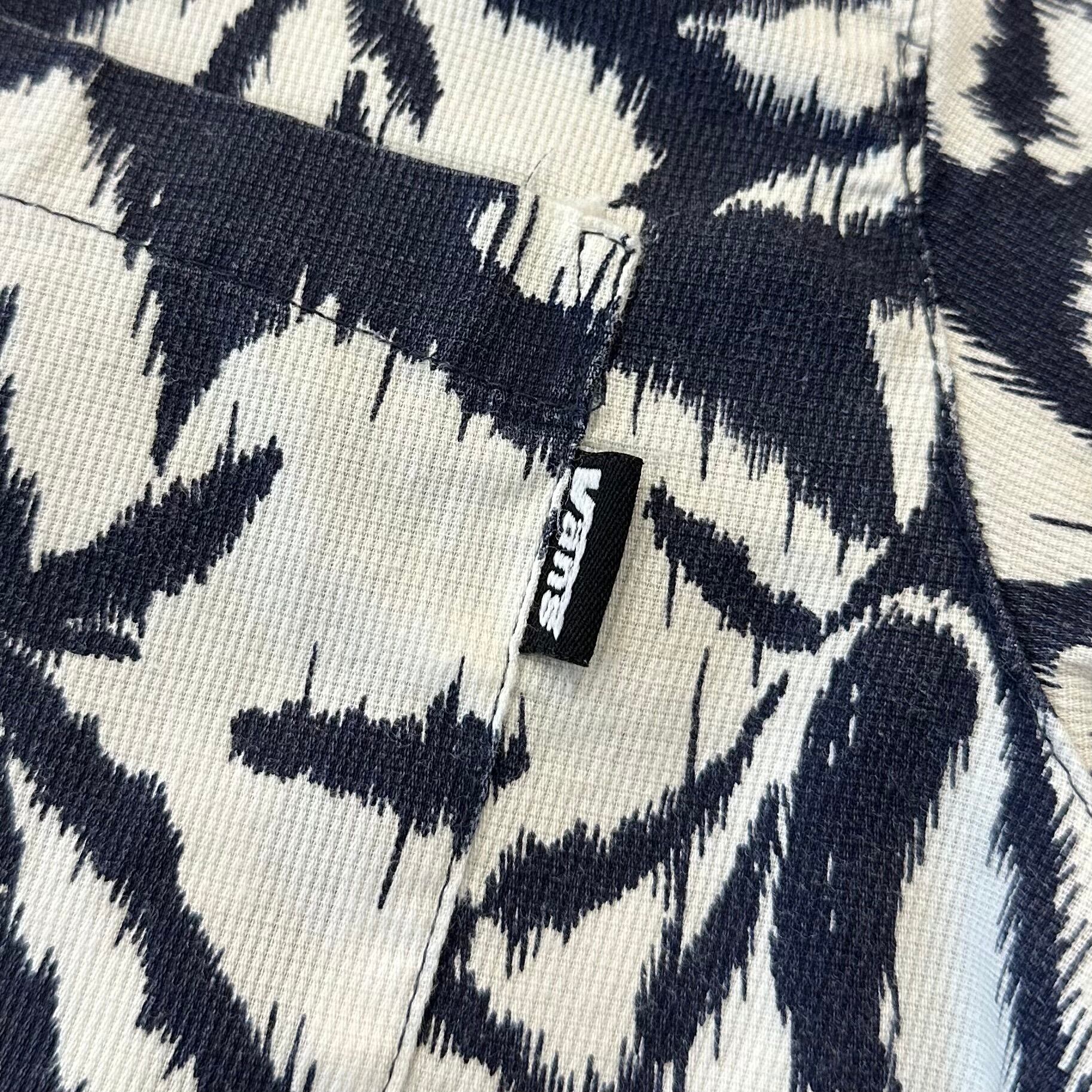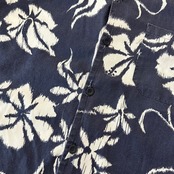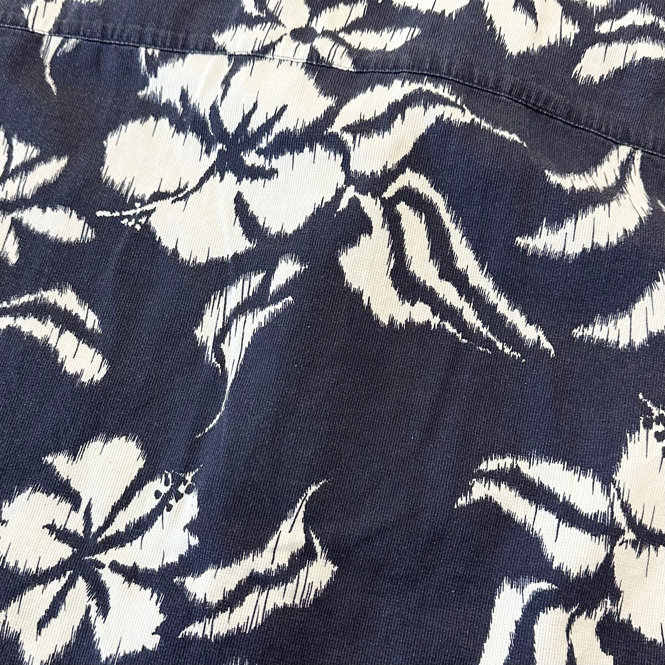 90年代vansの半袖シャツ。抜染の様な花柄が特徴的でダークネイビーベースのクールなハワイアンシャツ。