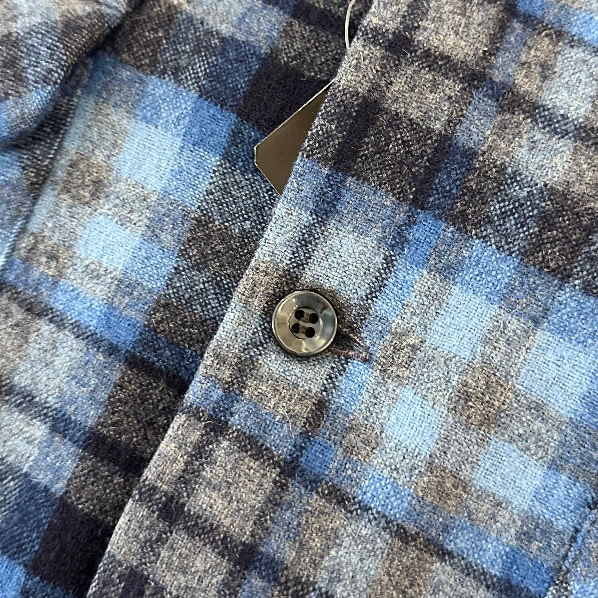 小ぶりな襟、光沢のあるボタン。