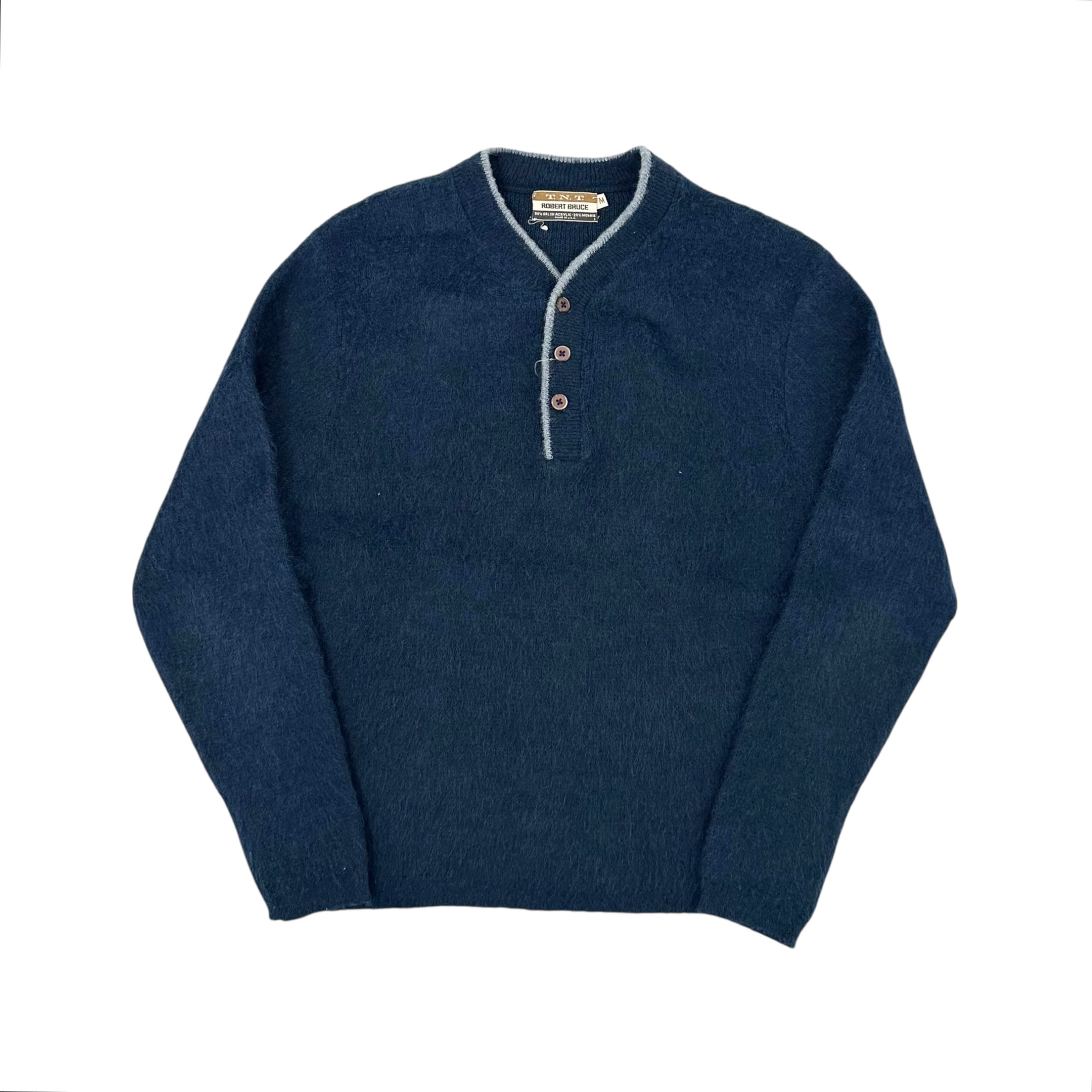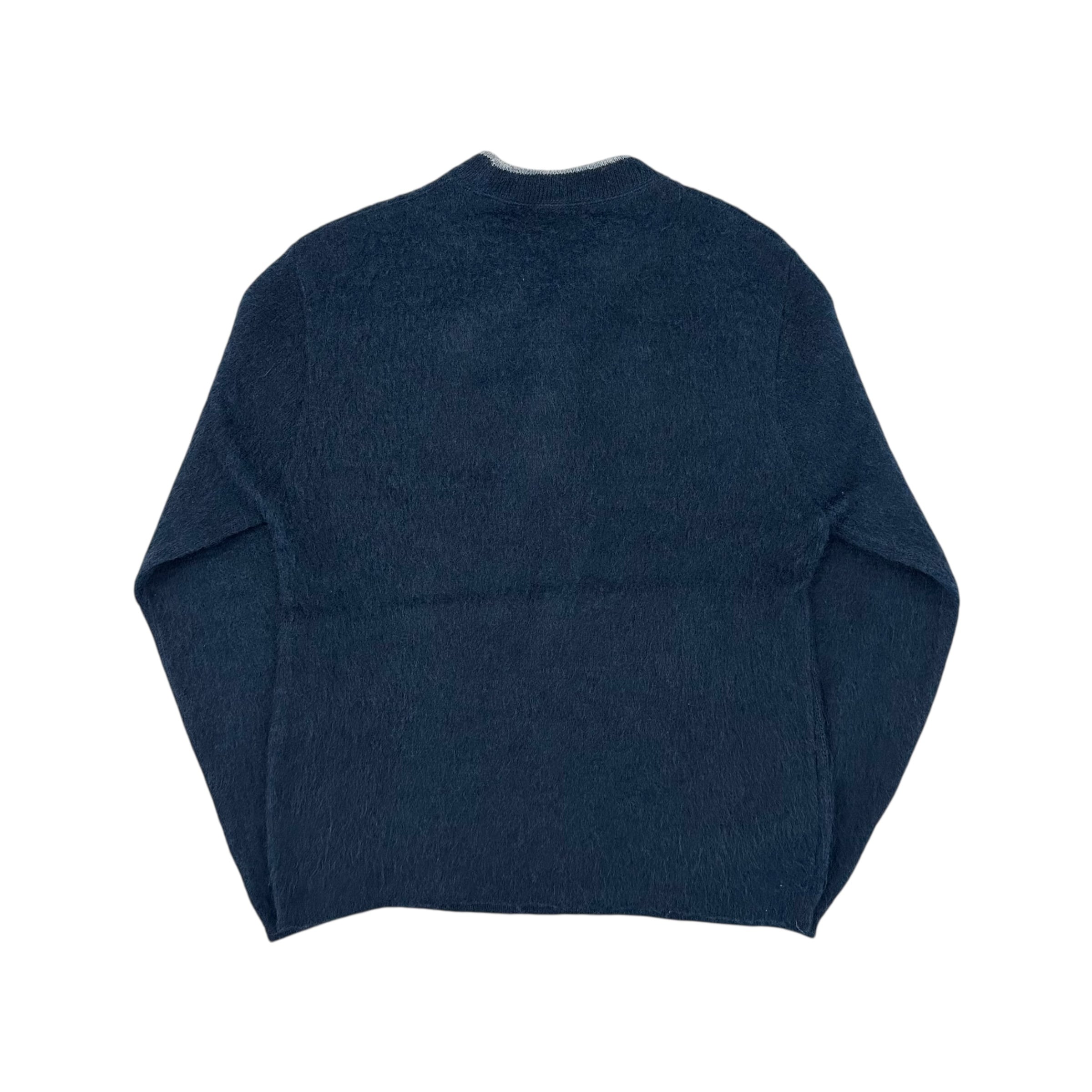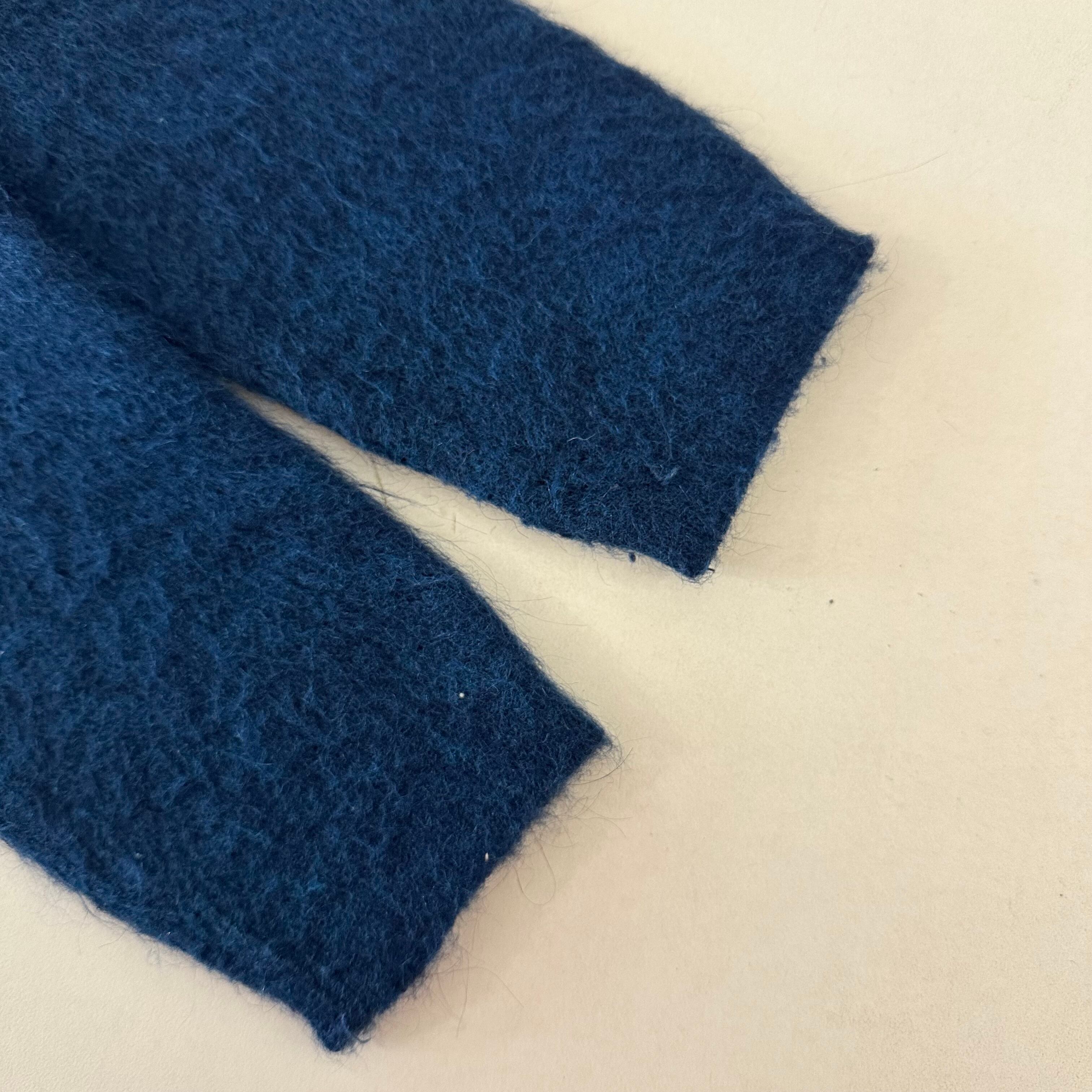 青ベースのクルーネックモヘア。